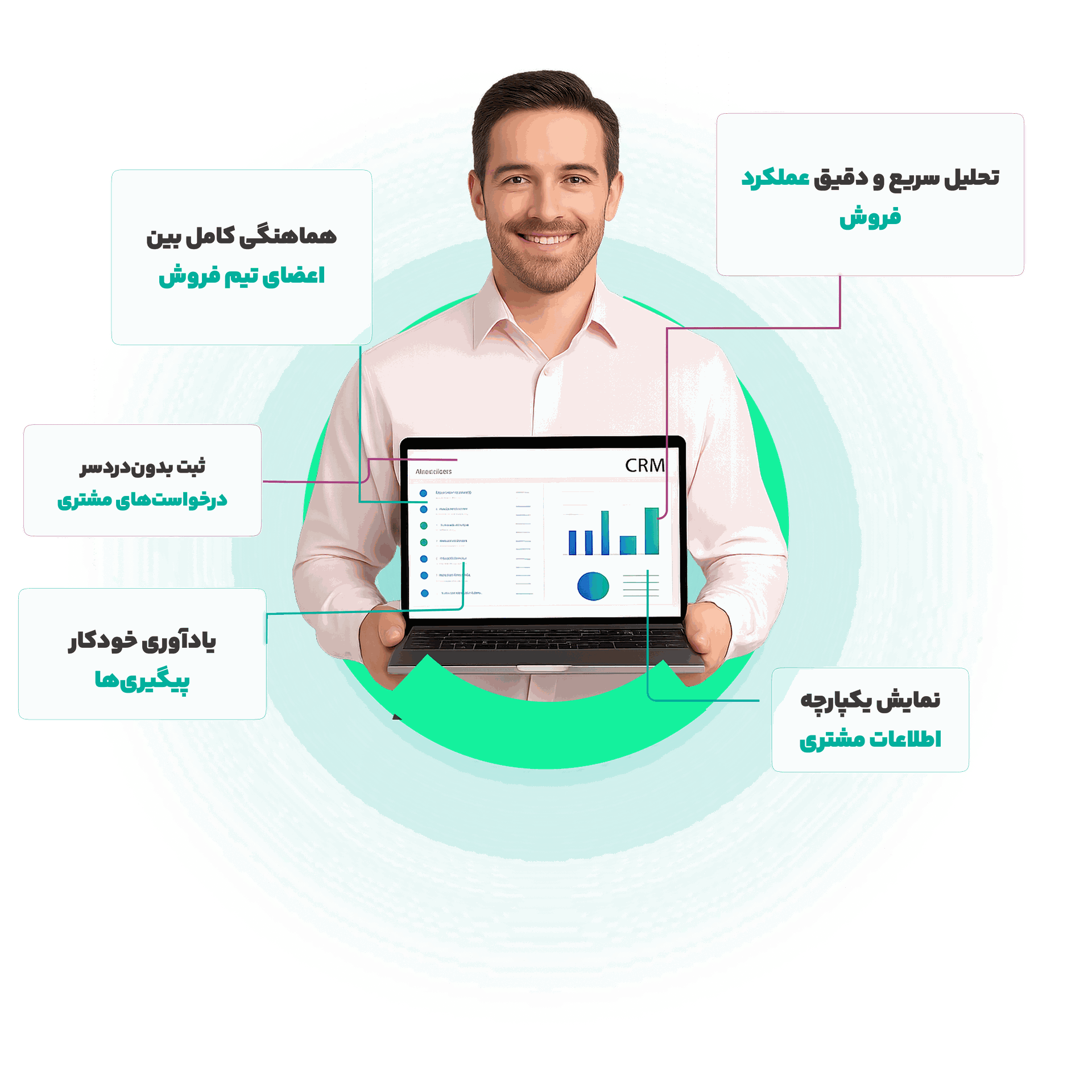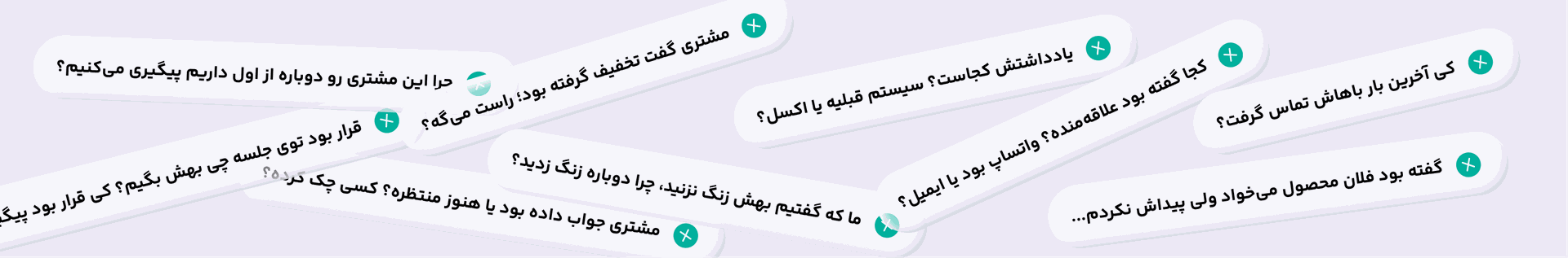 از اولین تعامل تا آخرین خرید، همهچی ثبت میشه — نه تو ذهن کارشناس فروش، بلکه جایی که همه دسترسی دارن.
