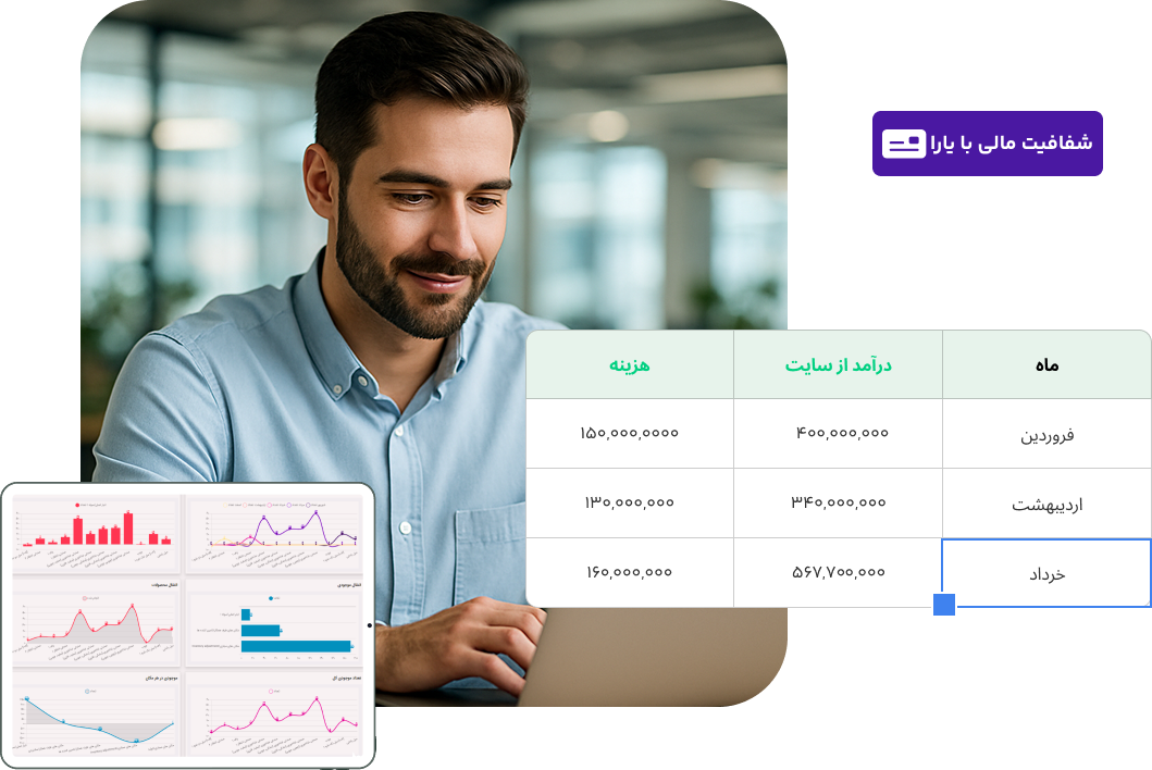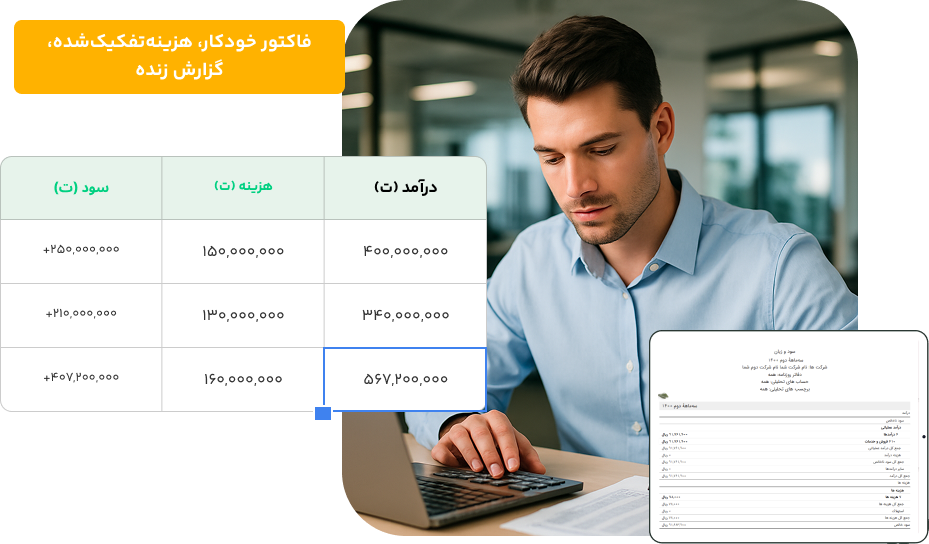 🧮 گره گزارش مالی: درآمد و هزینههات تو شعب و دست افراد مختلف پراکندهست و نمیدونی دقیقاً کجا سود میکنی یا کجا هزینههات بالا رفته.