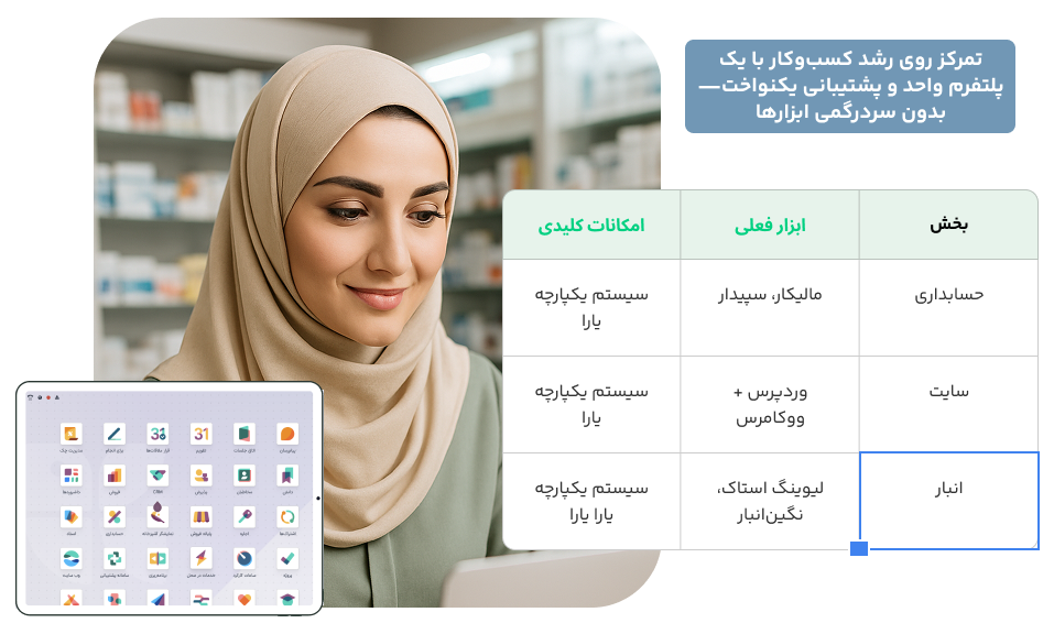 ⚙️ گره ابزار و نرمافزار: برای هر کار یه نرمافزار خریدی—یکی انبار، یکی فروش، یکی حسابداری—حالا باید بین چند سیستم، آموزش و پشتیبانی مختلف سرگردون شی.