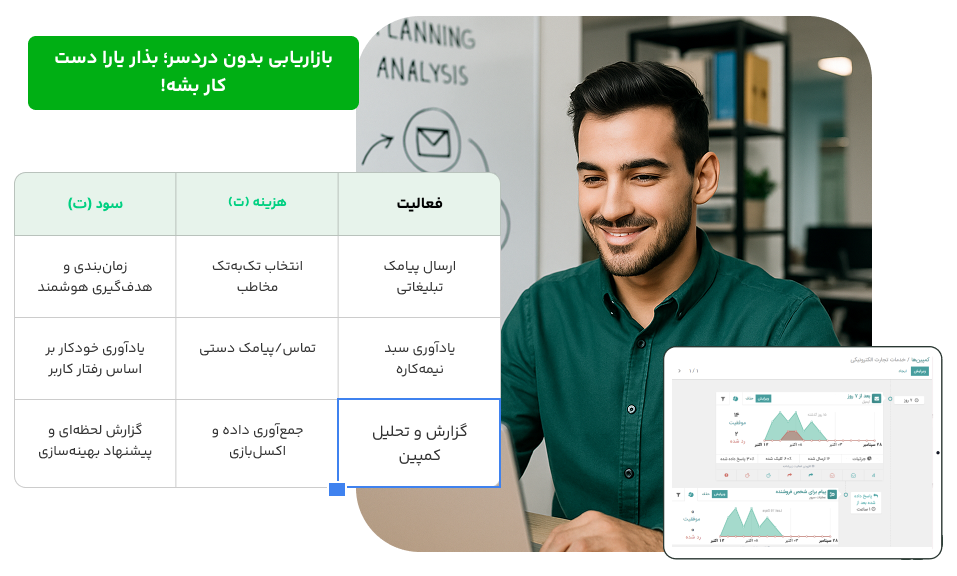 ما اول بهعنوان مشاور کنار شما مینشینیم تا فرآیند بازاریابی فعلیتون رو مو به مو بررسی کنیم و بفهمیم کجاها وقتتون هدر میره و چه پیامهایی بیشترین بازخورد رو دارند. بعد با پیادهسازی یارا در ماژول Marketing Automation، همهچی خودکار میشه—از زمانبندی پیامک و ایمیل تبلیغاتی تا یادآوری سبدهای نیمهکاره و تحلیل نتایج کمپین؛ طوریکه تیم فروشت آزاد میشه برای تمرکز روی مشتریهای واقعی و هیچ فرصت فروشی از دست نمیره!
